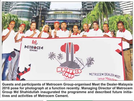 Guests and participants of Metrocem Group-organized “Meet the Dealer-Malaysia 2016” pose for photograph at a function recently. Managing Director of Metrocem Group Md Shahidullah inaugurated the program and described future initiatives and activities of Metrocem Cement. Published: The Financial Express, Dated: 09 June 2016, Page Trade and Marketing Online Link: http://epaper.thefinancialexpress.com.bd/?archiev=yes&arch_date=09-06-2016