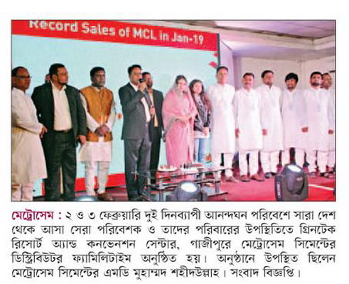 ২ ও ৩ ফেব্রæয়ারি দুই দিনব্যাপী আনন্দঘন পরিবেশে সারা দেশ থেকে আসা সেরা পরিবেশক ও তাদের পরিবারের উপস্থিতিতে গ্রিনটেক রিসোর্টে অ্যান্ড কনভেনশন সেন্টার, গাজীপুরে মেট্রোসেম সিমেন্টের ডিস্ট্রিবিউটর ফ্যামিলি টাইম অনুষ্ঠিত হয়। অনুষ্ঠানে উপস্থিত ছিলেন মেট্রোসেম সিমেন্টের এমডি মুহাম্মদ শহীদউল্লাহ। প্রচারিতঃ কালের কণ্ঠ, তারিখঃ ০৬ ফেব্রæয়ারি ২০১৯, পৃষ্ঠাঃ ৫ অনলাইন লিংকঃ https://www.ekalerkantho.com/home/page/2019-02-06/5